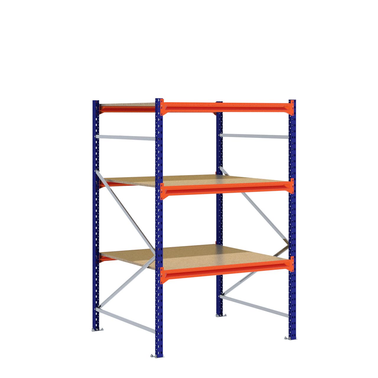 Deze grootvakstelling van 2.000 x 1.300 x 1.200 mm wordt standaard uitgerust met 3 legbordniveaus (Een legbordniveau bestaat uit twee liggers en één spaanplaat.) De stijlen zijn afgewerkt met RAL 5003 blauw, de liggers zijn afgewerkt in RAL 2004 oranje en de schoringen en voetplaten zijn verzinkt. (De stijlen en liggers zijn voorzien van epoxy polyester.)