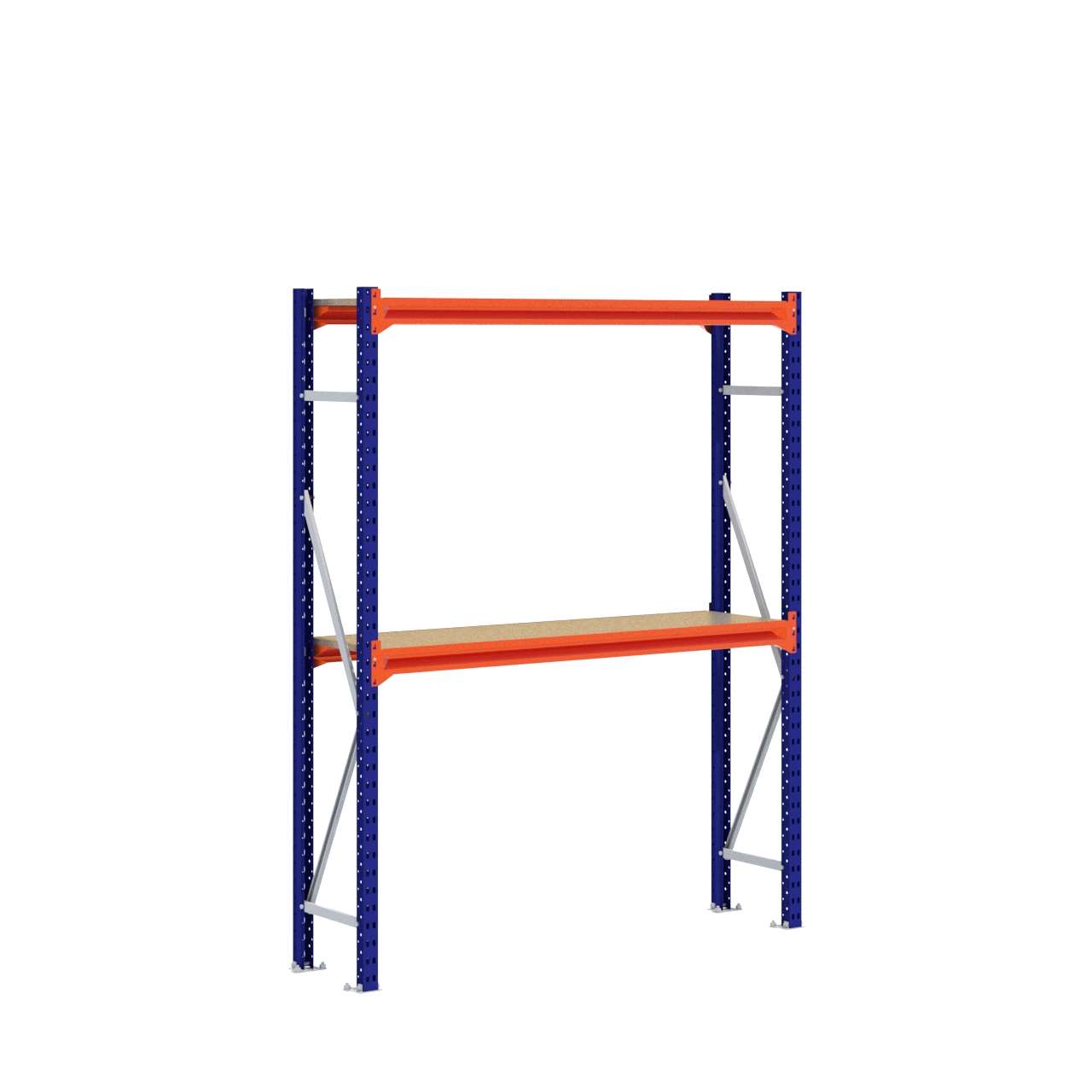 Deze grootvakstelling van 2.000 x 1.600 x 400 mm wordt standaard uitgerust met 2 legbordniveaus (Een legbordniveau bestaat uit twee liggers en één spaanplaat.) De stijlen zijn afgewerkt met RAL 5003 blauw, de liggers zijn afgewerkt in RAL 2004 oranje en de schoringen en voetplaten zijn verzinkt. (De stijlen en liggers zijn voorzien van epoxy polyester.)