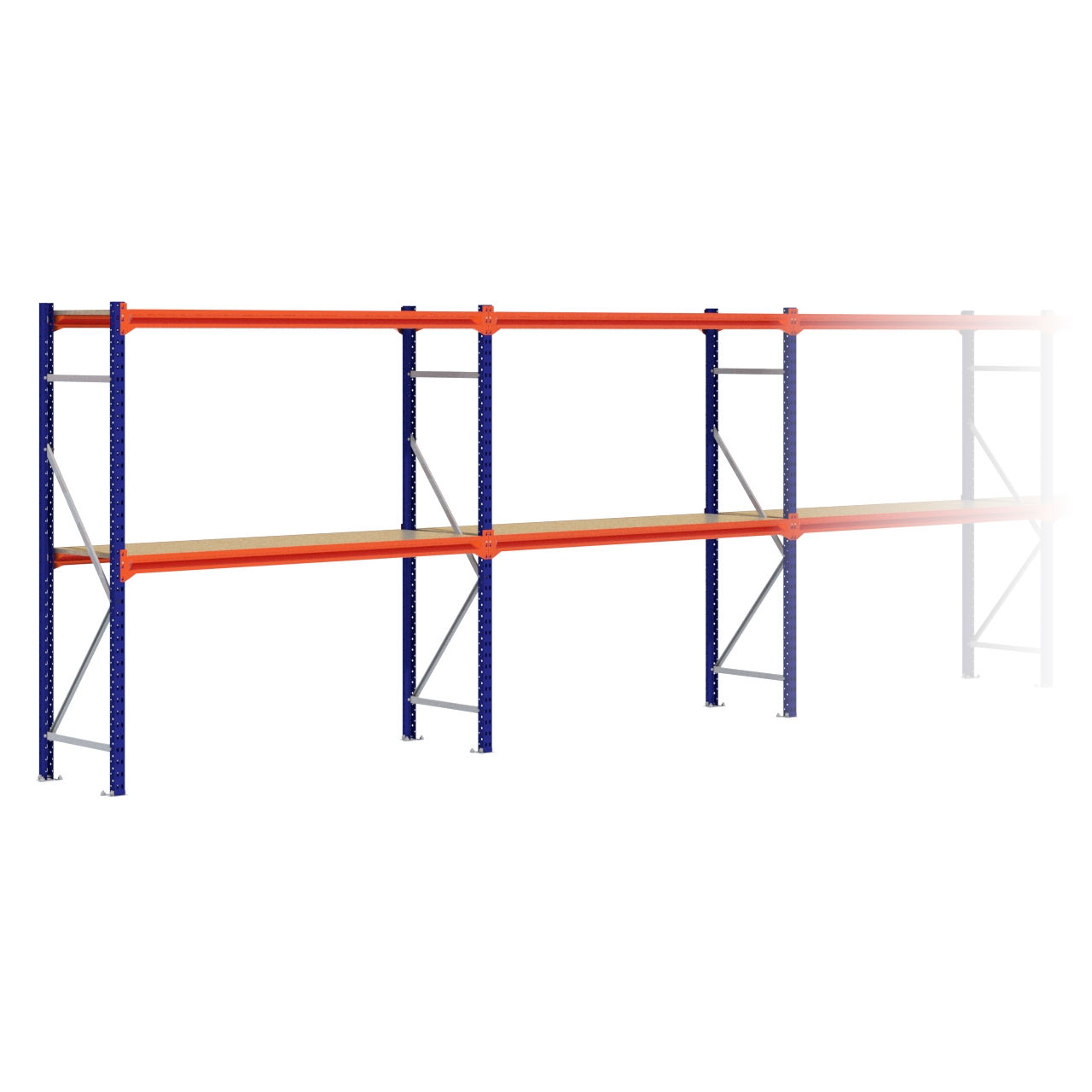 Deze grootvakstelling van 2.000 x 13.400 x 600 mm wordt standaard uitgerust met 2 legbordniveaus (Een legbordniveau bestaat uit twee liggers en één spaanplaat.) De stijlen zijn afgewerkt met RAL 5003 blauw, de liggers zijn afgewerkt in RAL 2004 oranje en de schoringen en voetplaten zijn verzinkt. (De stijlen en liggers zijn voorzien van epoxy polyester.)