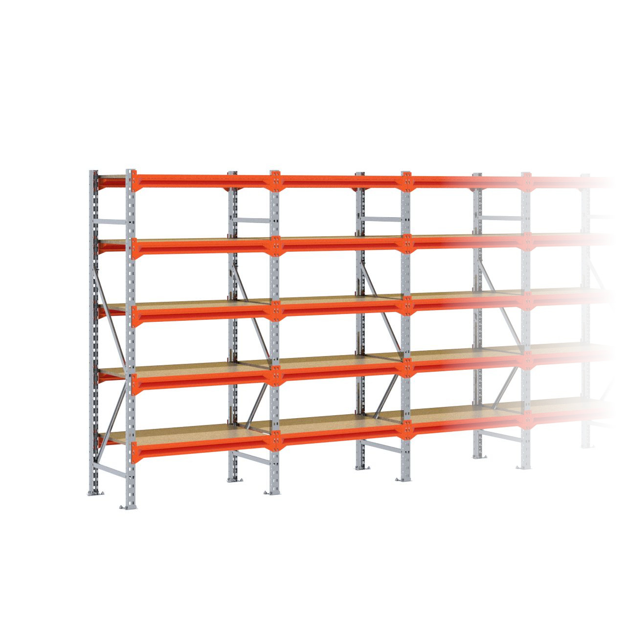 Deze grootvakstelling van 2.000 x 3.850 x 600 mm wordt standaard uitgerust met 5 legbordniveaus (Een legbordniveau bestaat uit twee liggers en één spaanplaat.) De stijlen zijn gegalvaniseerd (Metaal grijs) afgewerkt, de liggers zijn afgewerkt in RAL 2004 oranje en de schoringen en voetplaten zijn verzinkt. (De stijlen en liggers zijn voorzien van epoxy polyester.)