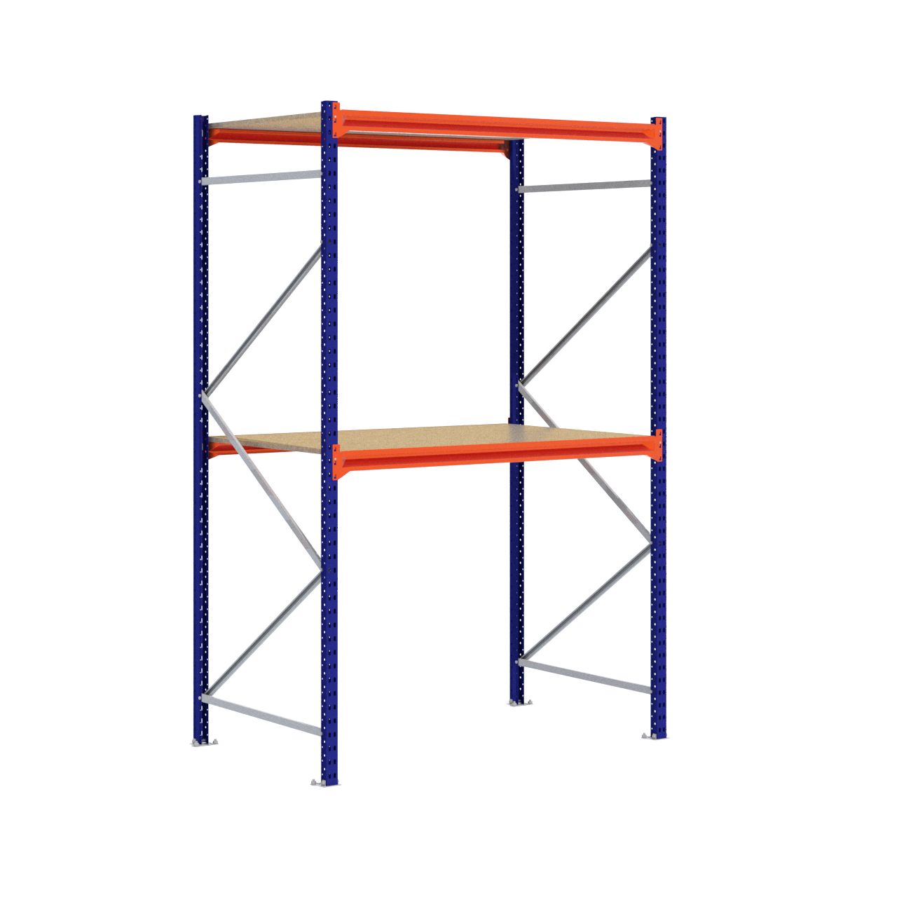 Deze grootvakstelling van 2.500 x 1.600 x 1000 mm wordt standaard uitgerust met 2 legbordniveaus (Een legbordniveau bestaat uit twee liggers en één spaanplaat.) De stijlen zijn afgewerkt met RAL 5003 blauw, de liggers zijn afgewerkt in RAL 2004 oranje en de schoringen en voetplaten zijn verzinkt. (De stijlen en liggers zijn voorzien van epoxy polyester.)