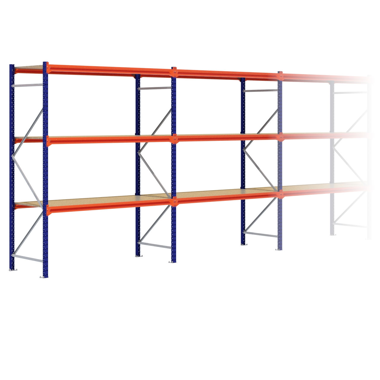 Deze grootvakstelling van 2.500 x 11.500 x 800 mm wordt standaard uitgerust met 3 legbordniveaus (Een legbordniveau bestaat uit twee liggers en één spaanplaat.) De stijlen zijn afgewerkt met RAL 5003 blauw, de liggers zijn afgewerkt in RAL 2004 oranje en de schoringen en voetplaten zijn verzinkt. (De stijlen en liggers zijn voorzien van epoxy polyester.)