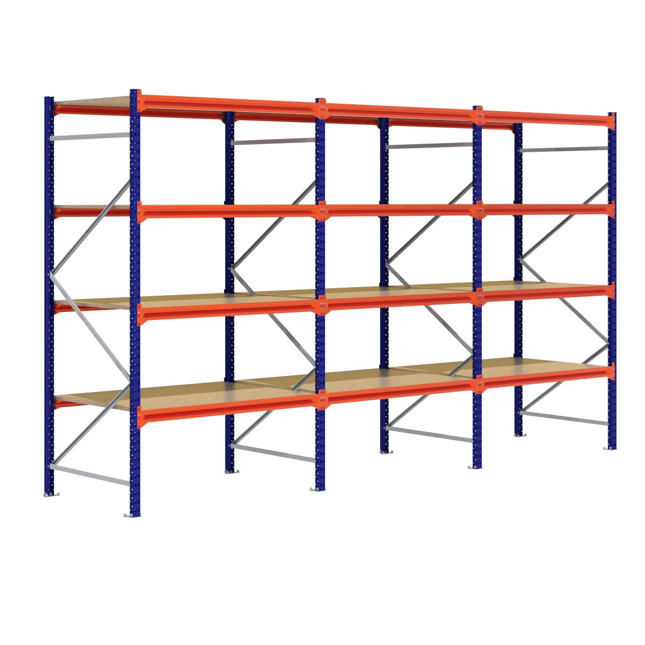 Deze grootvakstelling van 2.500 x 4.300 x 1000 mm wordt standaard uitgerust met 4 legbordniveaus (Een legbordniveau bestaat uit twee liggers en één spaanplaat.) De stijlen zijn afgewerkt met RAL 5003 blauw, de liggers zijn afgewerkt in RAL 2004 oranje en de schoringen en voetplaten zijn verzinkt. (De stijlen en liggers zijn voorzien van epoxy polyester.)