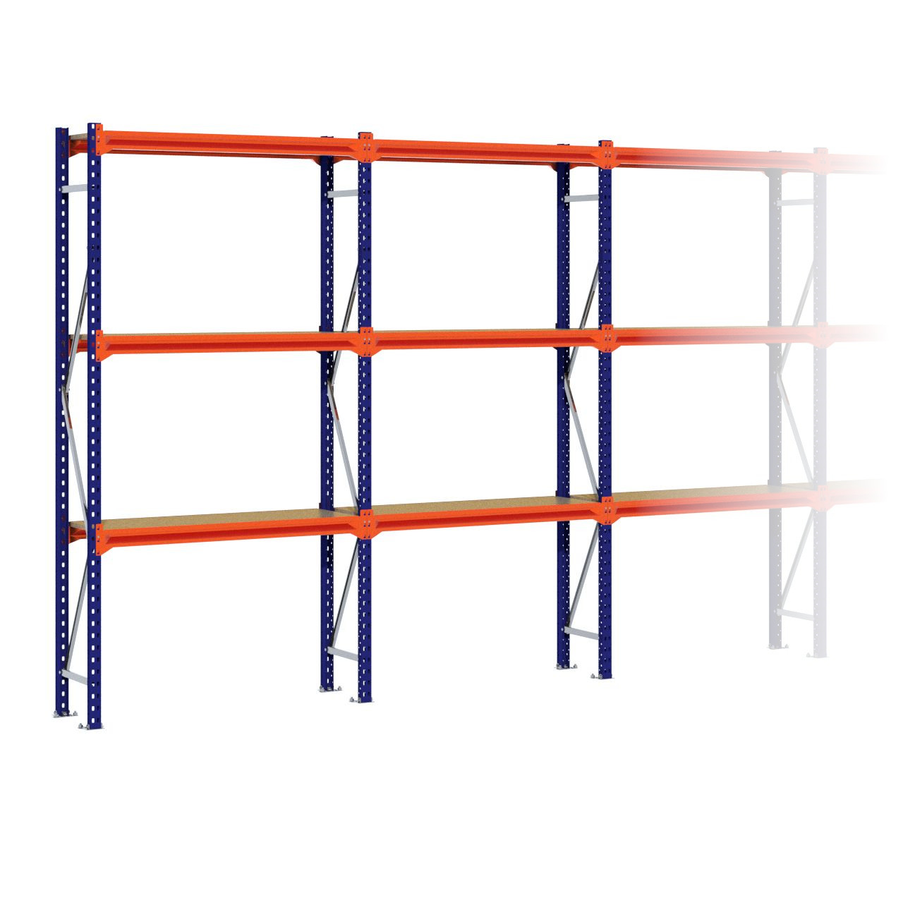 Deze grootvakstelling van 2.500 x 7.600 x 400 mm wordt standaard uitgerust met 3 legbordniveaus (Een legbordniveau bestaat uit twee liggers en één spaanplaat.) De stijlen zijn afgewerkt met RAL 5003 blauw, de liggers zijn afgewerkt in RAL 2004 oranje en de schoringen en voetplaten zijn verzinkt. (De stijlen en liggers zijn voorzien van epoxy polyester.)