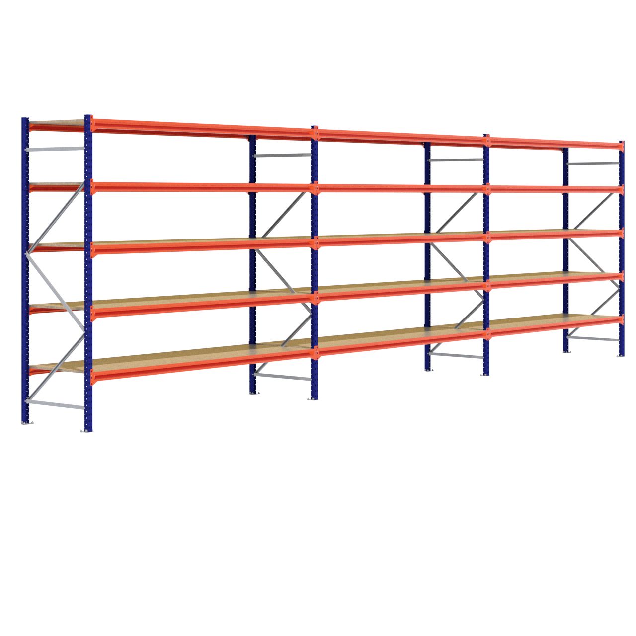 Deze grootvakstelling van 2.500 x 8.400 x 800 mm wordt standaard uitgerust met 5 legbordniveaus (Een legbordniveau bestaat uit twee liggers en één spaanplaat.) De stijlen zijn afgewerkt met RAL 5003 blauw, de liggers zijn afgewerkt in RAL 2004 oranje en de schoringen en voetplaten zijn verzinkt. (De stijlen en liggers zijn voorzien van epoxy polyester.)