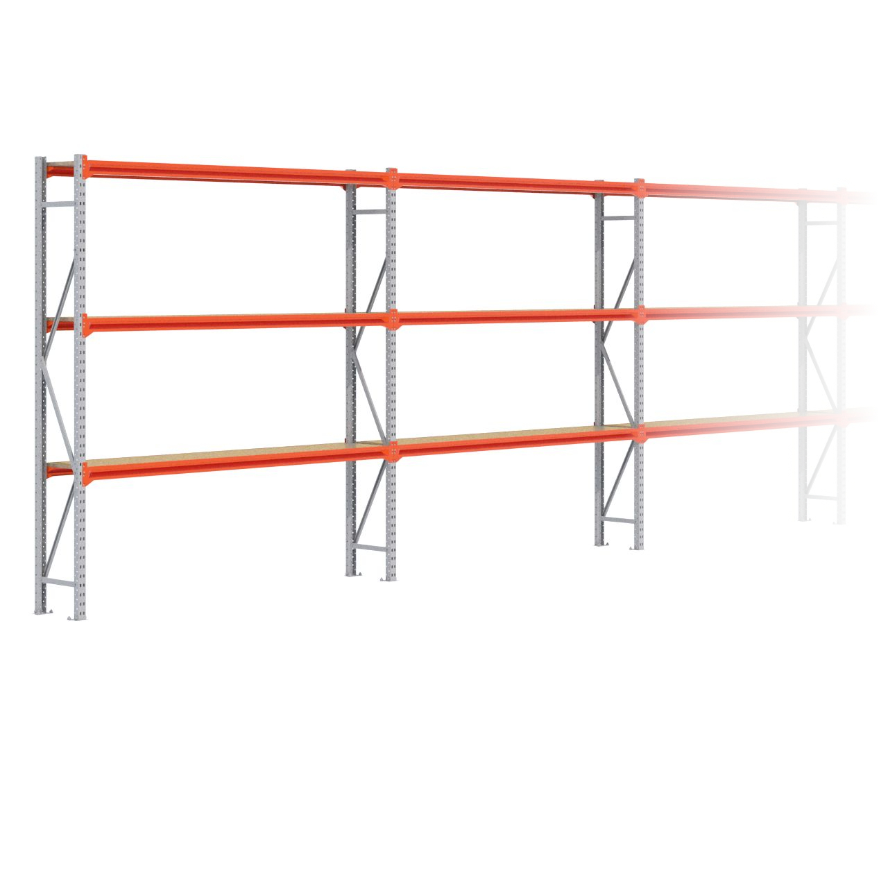 Deze grootvakstelling van 2.500 x 9.300 x 400 mm wordt standaard uitgerust met 3 legbordniveaus (Een legbordniveau bestaat uit twee liggers en één spaanplaat.) De stijlen zijn gegalvaniseerd (Metaal grijs) afgewerkt, de liggers zijn afgewerkt in RAL 2004 oranje en de schoringen en voetplaten zijn verzinkt. (De stijlen en liggers zijn voorzien van epoxy polyester.)