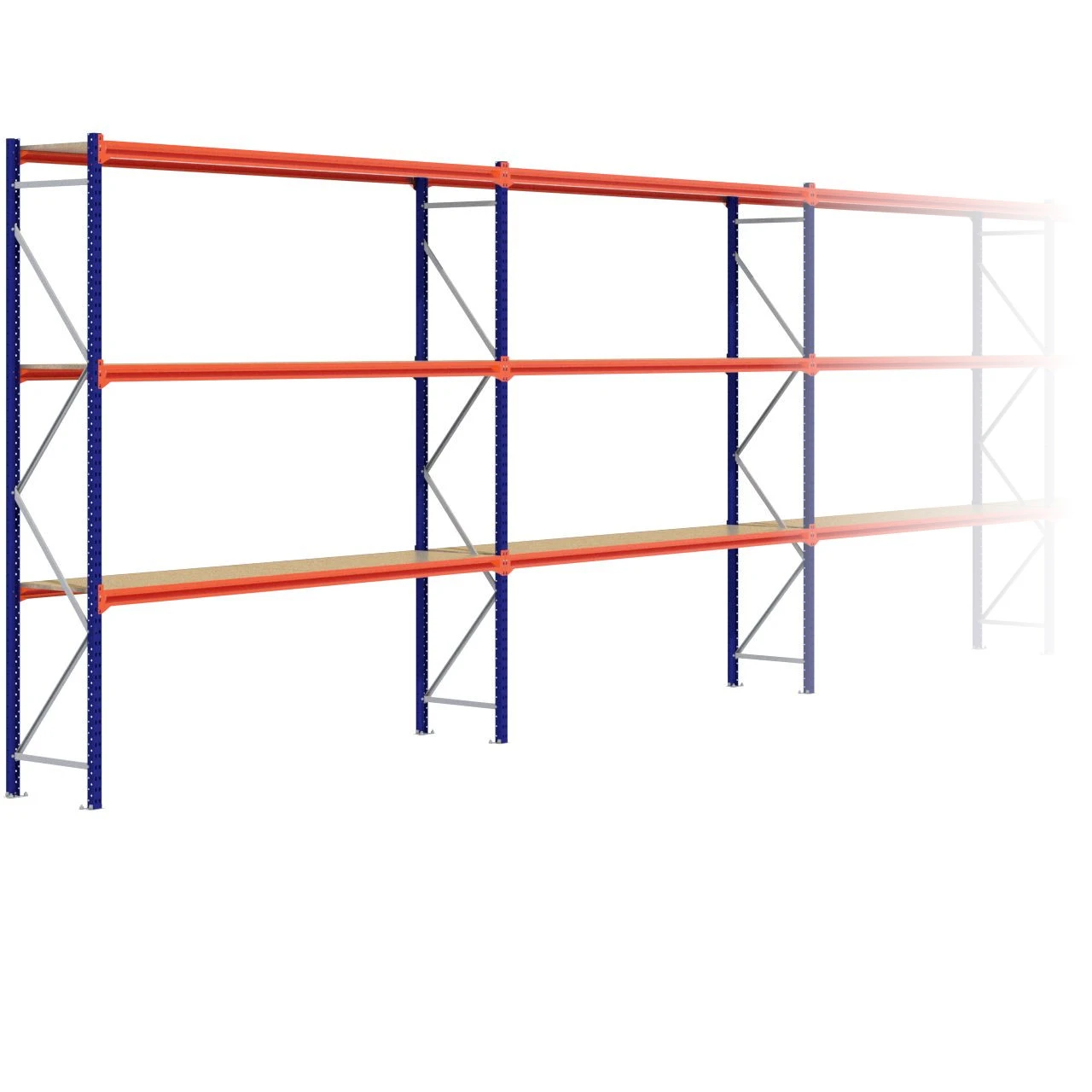 Deze grootvakstelling van 3.000 x 27.600 x 600 mm wordt standaard uitgerust met 3 legbordniveaus (Een legbordniveau bestaat uit twee liggers en één spaanplaat.) De stijlen zijn afgewerkt met RAL 5003 blauw, de liggers zijn afgewerkt in RAL 2004 oranje en de schoringen en voetplaten zijn verzinkt. (De stijlen en liggers zijn voorzien van epoxy polyester.)