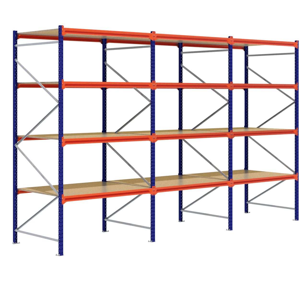 Deze grootvakstelling van 3.000 x 4.700 x 1200 mm wordt standaard uitgerust met 4 legbordniveaus (Een legbordniveau bestaat uit twee liggers en één spaanplaat.) De stijlen zijn afgewerkt met RAL 5003 blauw, de liggers zijn afgewerkt in RAL 2004 oranje en de schoringen en voetplaten zijn verzinkt. (De stijlen en liggers zijn voorzien van epoxy polyester.)