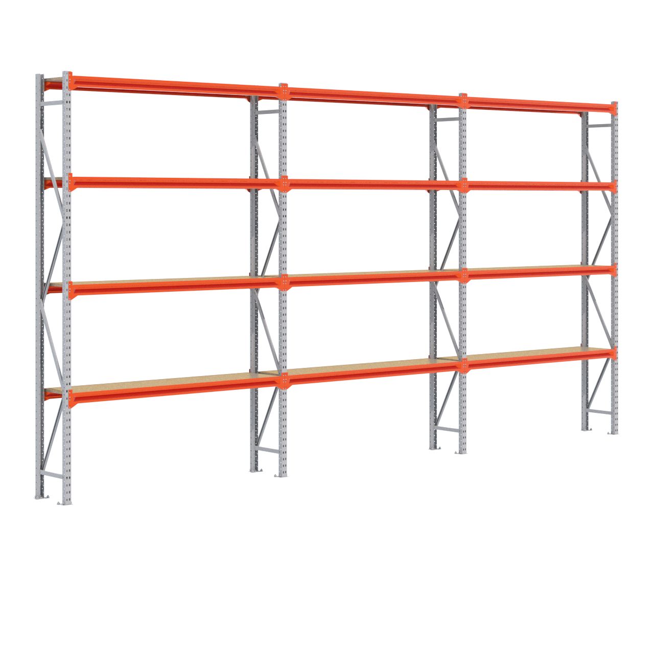 Deze grootvakstelling van 3.000 x 5.800 x 400 mm wordt standaard uitgerust met 4 legbordniveaus (Een legbordniveau bestaat uit twee liggers en één spaanplaat.) De stijlen zijn afgewerkt met RAL 5003 blauw, de liggers zijn afgewerkt in RAL 2004 oranje en de schoringen en voetplaten zijn verzinkt. (De stijlen en liggers zijn voorzien van epoxy polyester.)