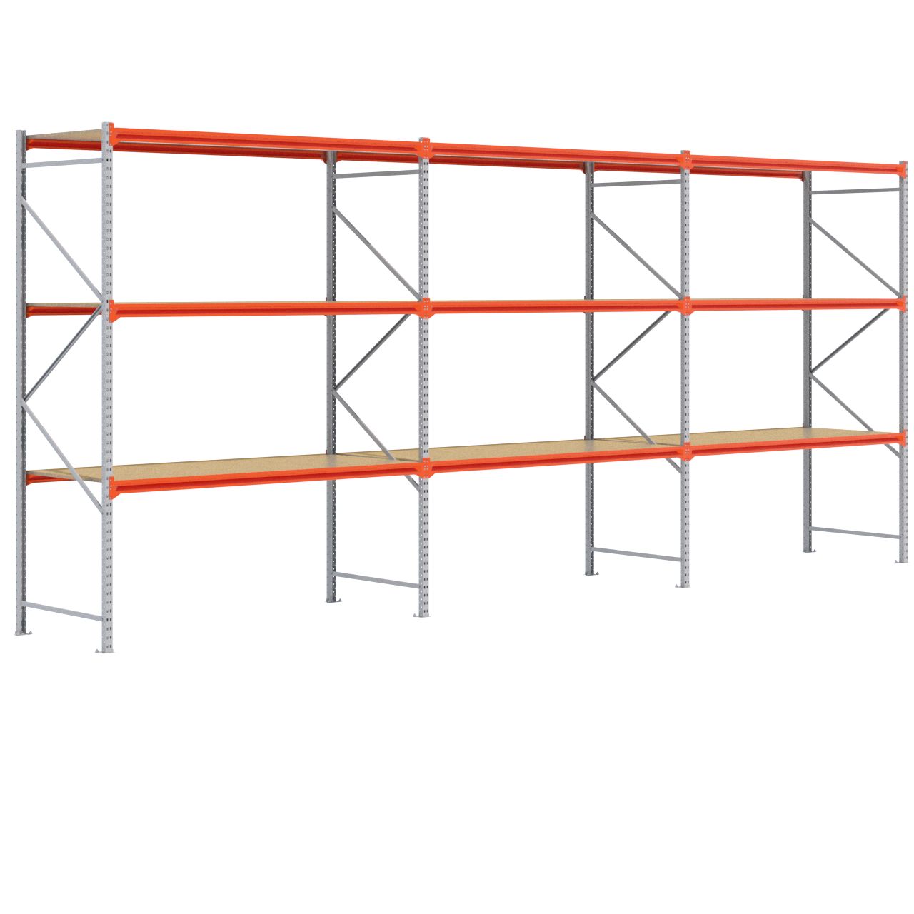 Deze grootvakstelling van 3.000 x 7.000 x 1000 mm wordt standaard uitgerust met 3 legbordniveaus (Een legbordniveau bestaat uit twee liggers en één spaanplaat.) De stijlen zijn afgewerkt met RAL 5003 blauw, de liggers zijn afgewerkt in RAL 2004 oranje en de schoringen en voetplaten zijn verzinkt. (De stijlen en liggers zijn voorzien van epoxy polyester.)