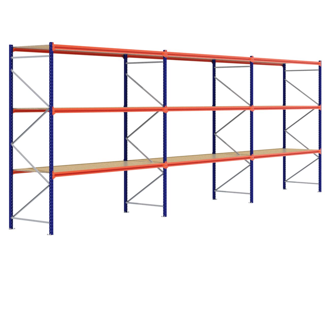 Deze grootvakstelling van 3.000 x 8.400 x 1000 mm wordt standaard uitgerust met 3 legbordniveaus (Een legbordniveau bestaat uit twee liggers en één spaanplaat.) De stijlen zijn afgewerkt met RAL 5003 blauw, de liggers zijn afgewerkt in RAL 2004 oranje en de schoringen en voetplaten zijn verzinkt. (De stijlen en liggers zijn voorzien van epoxy polyester.)