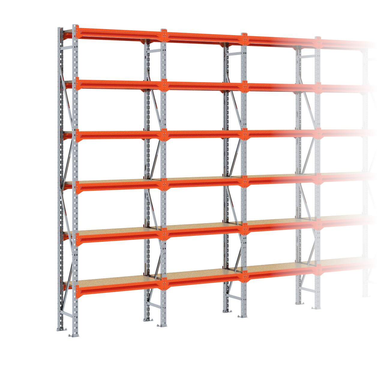 Deze grootvakstelling van 3.000 x 8.600 x 400 mm wordt standaard uitgerust met 6 legbordniveaus (Een legbordniveau bestaat uit twee liggers en één spaanplaat.) De stijlen zijn afgewerkt met RAL 5003 blauw, de liggers zijn afgewerkt in RAL 2004 oranje en de schoringen en voetplaten zijn verzinkt. (De stijlen en liggers zijn voorzien van epoxy polyester.)